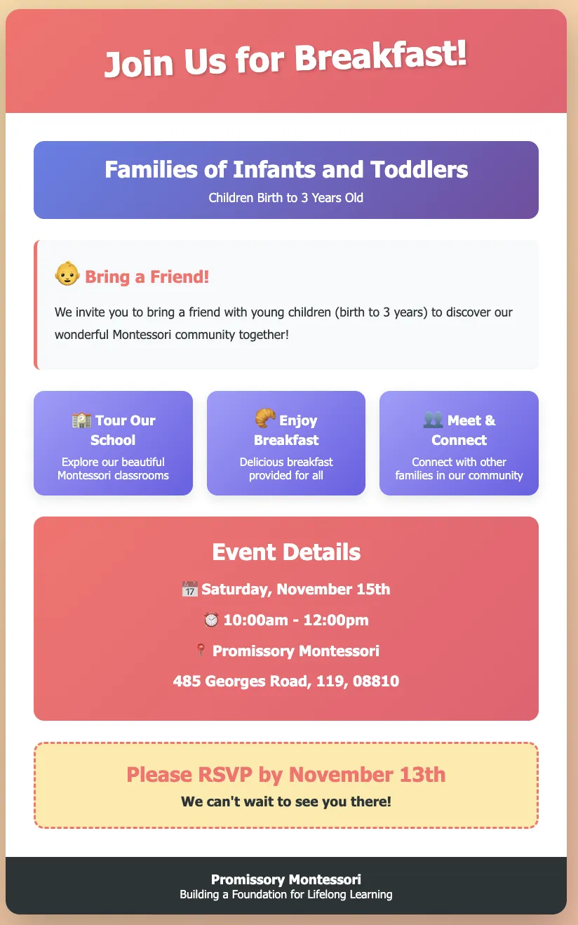 "We’ve been at Promissory Montessori since my daughter was just a few weeks old, and I’ve felt complete peace knowing she’s growing in such a loving, attentive environment."